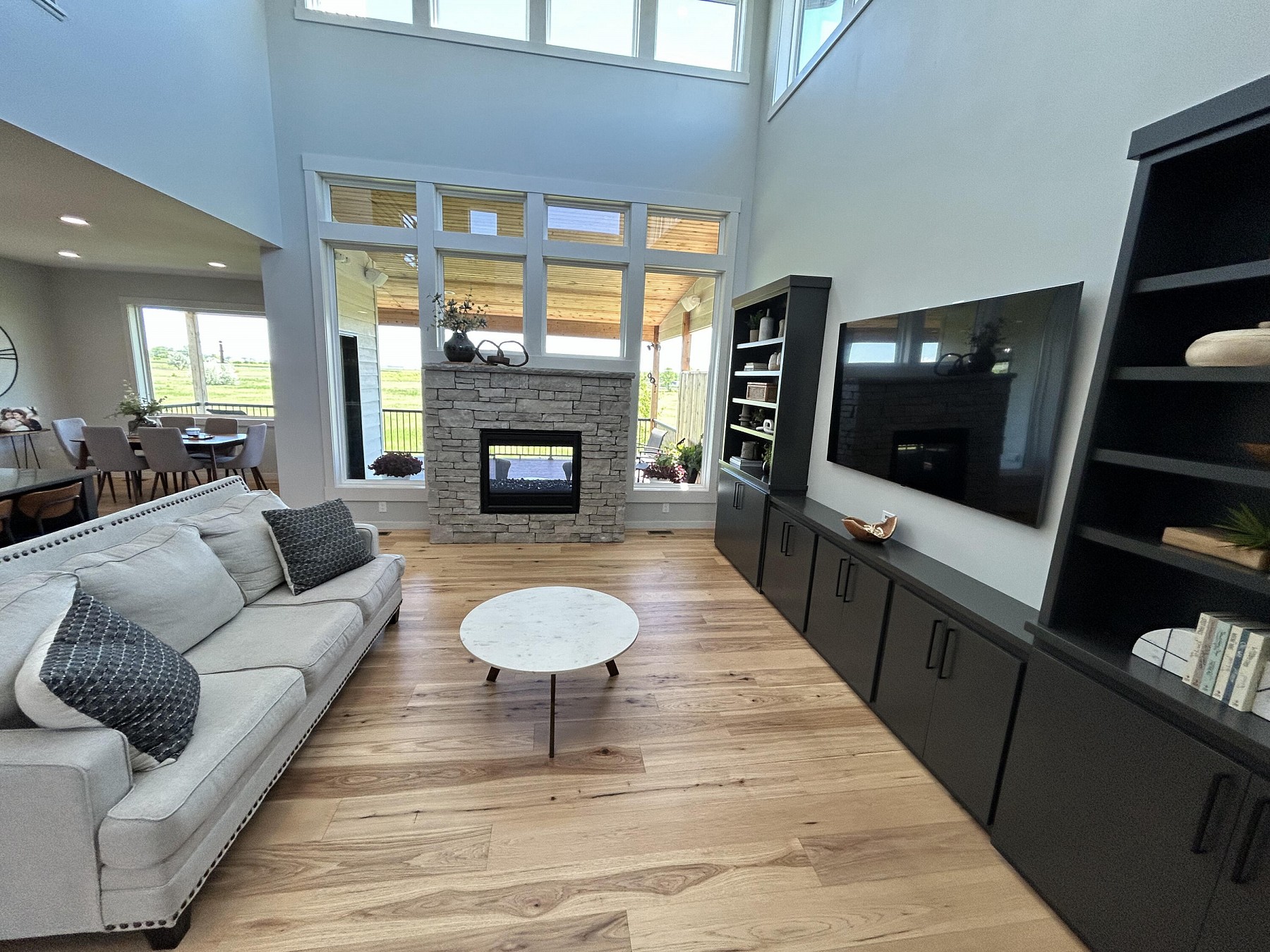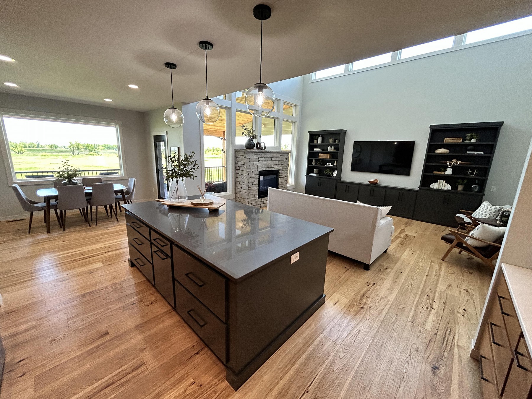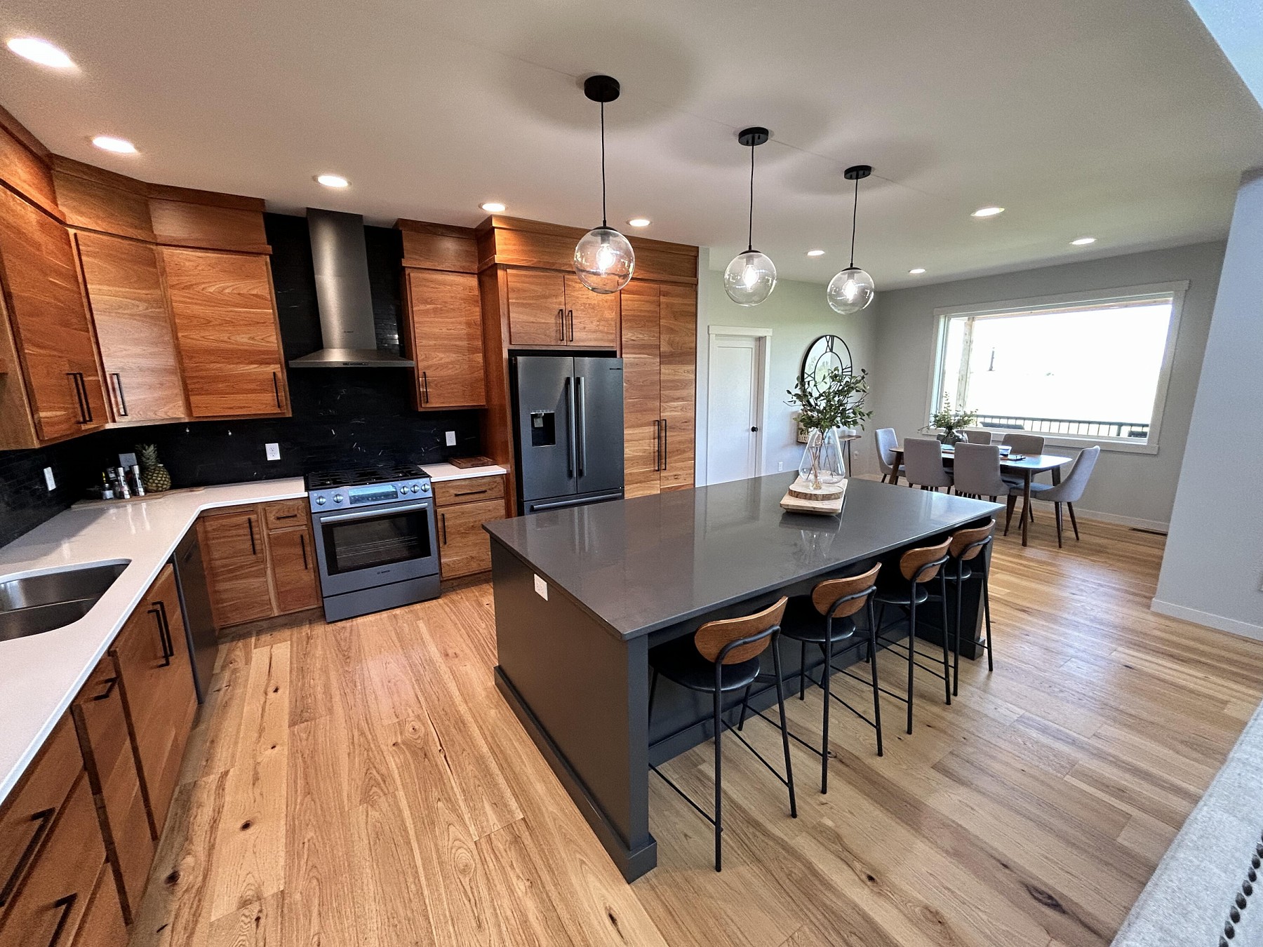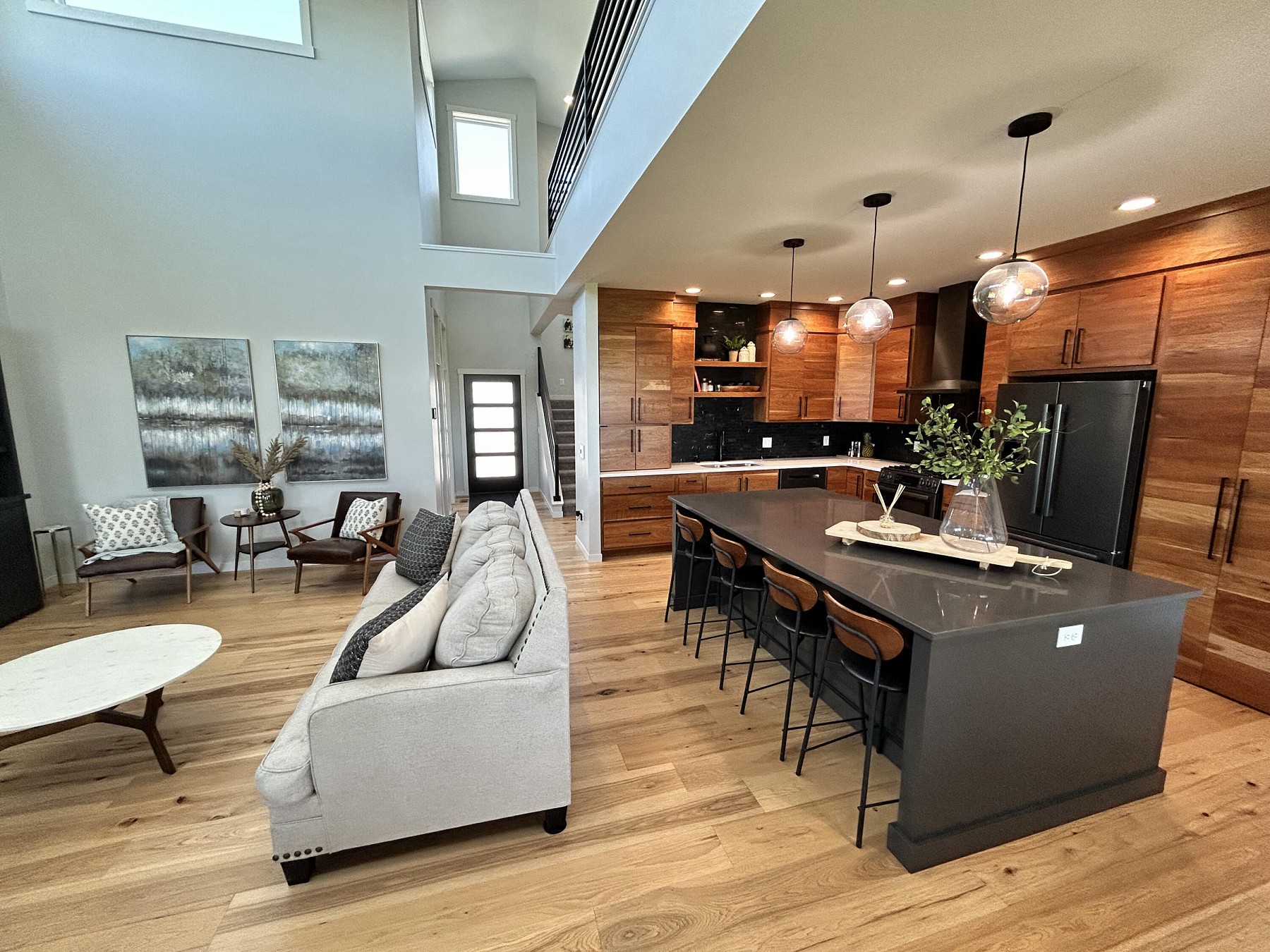 This spacious, single-family home features modern amenities and architectural character in a highly sought after location. You will love the abundance of natural light and views provided by the generous windows throughout the home. Entertaining guests and family will be a breeze with the open concept floor plan that features an expansive kitchen and dining space with direct access to the covered deck. The double sided fireplace will also offer warmth when spending late nights on the covered deck while enjoying the backyard views. You will also appreciate the sleek and modern custom bar that provides additional space for entertaining. For added convenience and accessibility, the laundry room, office, and master bedroom are located on the main level of this perfectly designed home
